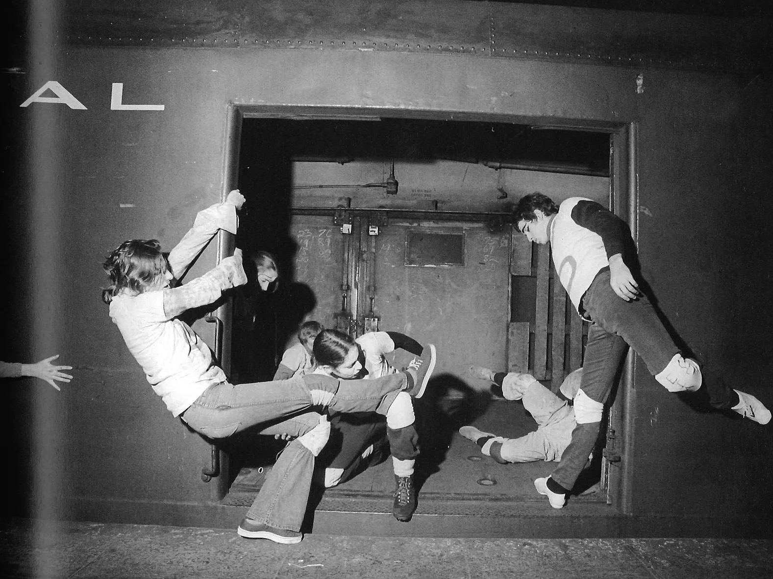 Dancers leverage an empty baggage car. The knee pads and denim are brilliant.